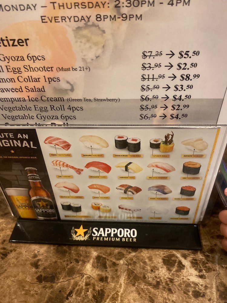 In: shrimp tempura, avocado, cream cheese. Out: spicy crab.